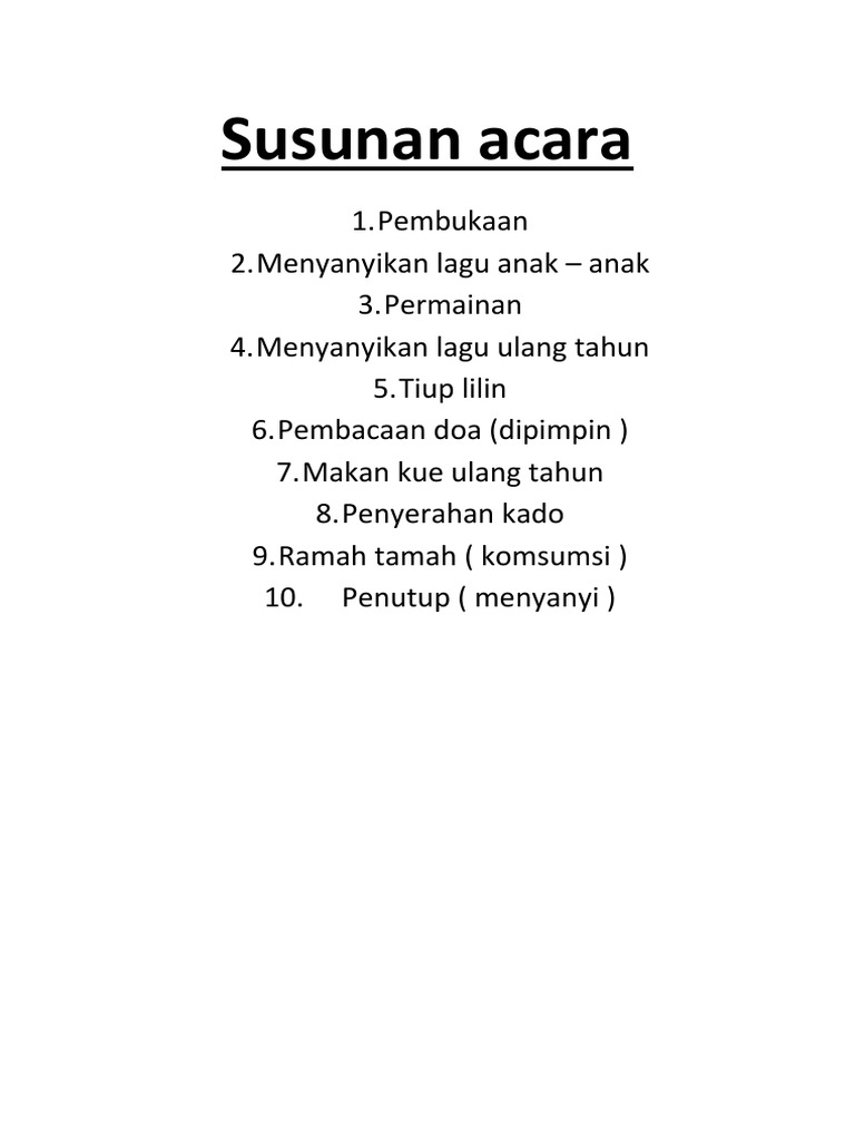 Susunan acara ulang tahun diatas ini dapat digunakan untuk membuat acara perayaan ulang tahun anak usia 1 3 5 7 8 dan 10 tahun. Senang apa tidak datang ke acara ulang tahun ini. Dari sekian pentingnya susunan acara tidak semua orang bisa membuatnya.