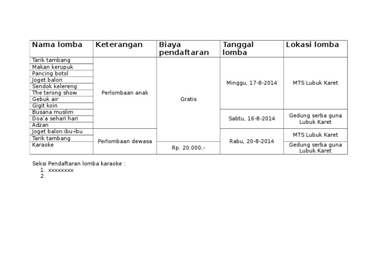 Contoh pendaftaran lomba 17 agustus. Pradita Utama Jakarta - Agar kegiatan 17 Agustus tercapai secara maksimal diperlukan perencanaan yang matang. Contoh proposal 17 agustus Setiap warga Negara Indonesia pasti merayakan yang namanya 17 agustusan Acara ini memang didiadakan untuk merayakan hari kemerdekaan bangsa Indonesia dan untuk mengenang jasa pahlawan yang telah berkorban jiwa dan raga untuk merebut kemerdekaan. Related Posts To Contoh Formulir Pendaftaran Lomba 17 Agustus Contoh Formulir Pendaftaran Lomba 17 Agustus 2017-10-22T113900-0700 Rating.