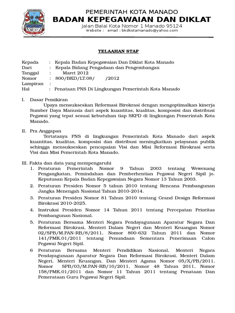 Kepala Badan Kepegawaian Dan Diklat Kota Manado Kepala Bidang Pengadaan dan Pengembangan Maret 2012 800BKDLT08 2012 Penataan PNS Di Lingkungan Pemerintah Kota Manado. Simpan Simpan Contoh Telaahan Staf Penataan Pns Untuk Nanti. Contoh telaah staf di dinas fightstaff.