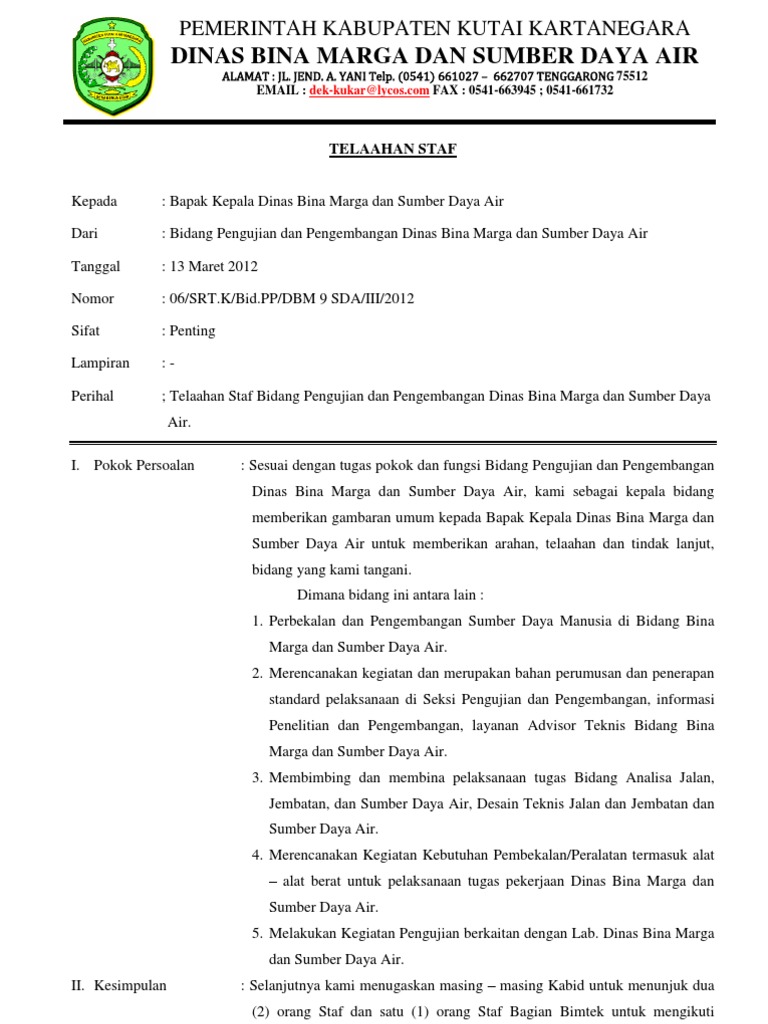 TELAAHAN STAF Kepada Dari Tanggal Nomor Lampiran Hal I. Tenggarong 13 Maret 2012 Kepala Bidang Pengujian Dan Pengembangan Dinas Bina Marga Sumber Daya Air. Silahkan COPY SALIN sebagian atau seluruh konten dari artikel ini.