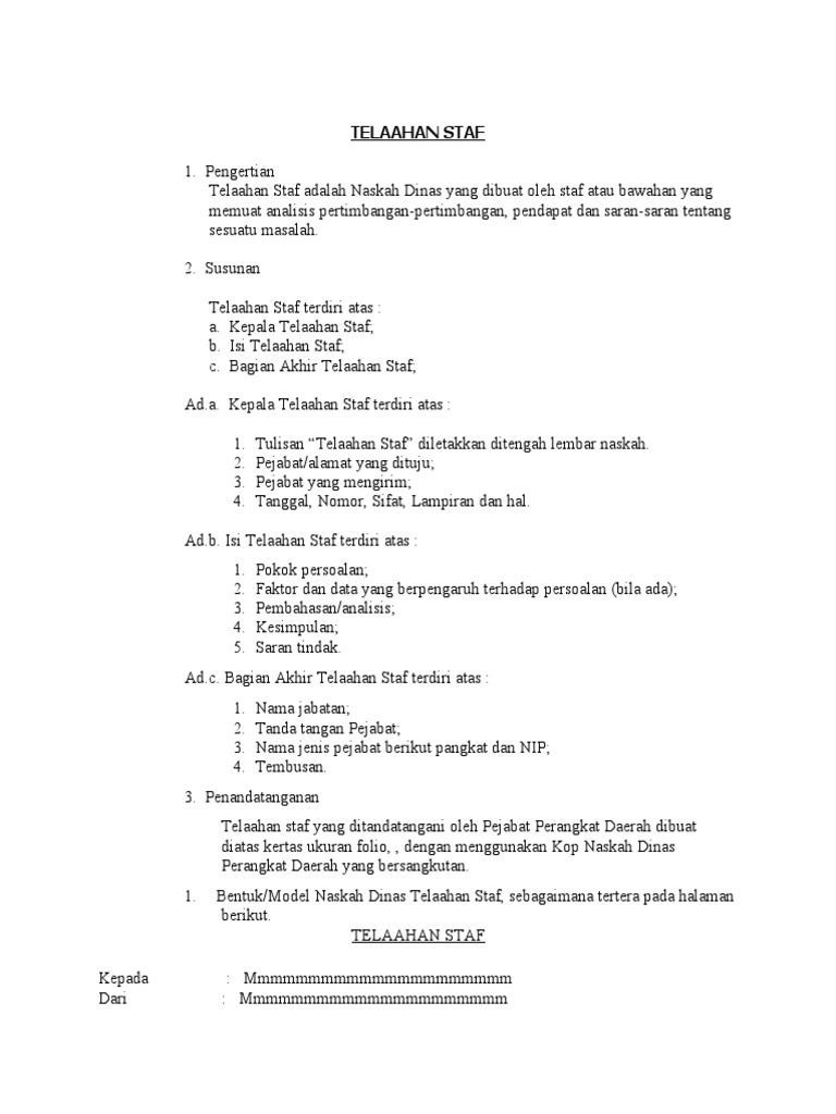 Telaahan Staf Reni Kcmtn. Contoh surat atau telaahan staf ini adalah merupakan surat tanggapan dari kepala bagian. Definisi Telahaan Staf Definisi Telaahan Staf yaitu sebuah Naskah Dinas yang dibuat oleh bawahan kepada atasan untuk mengungkapkan pendapat dan saran sebuah persoalan yang didasari oleh fakta dan data yang ada.