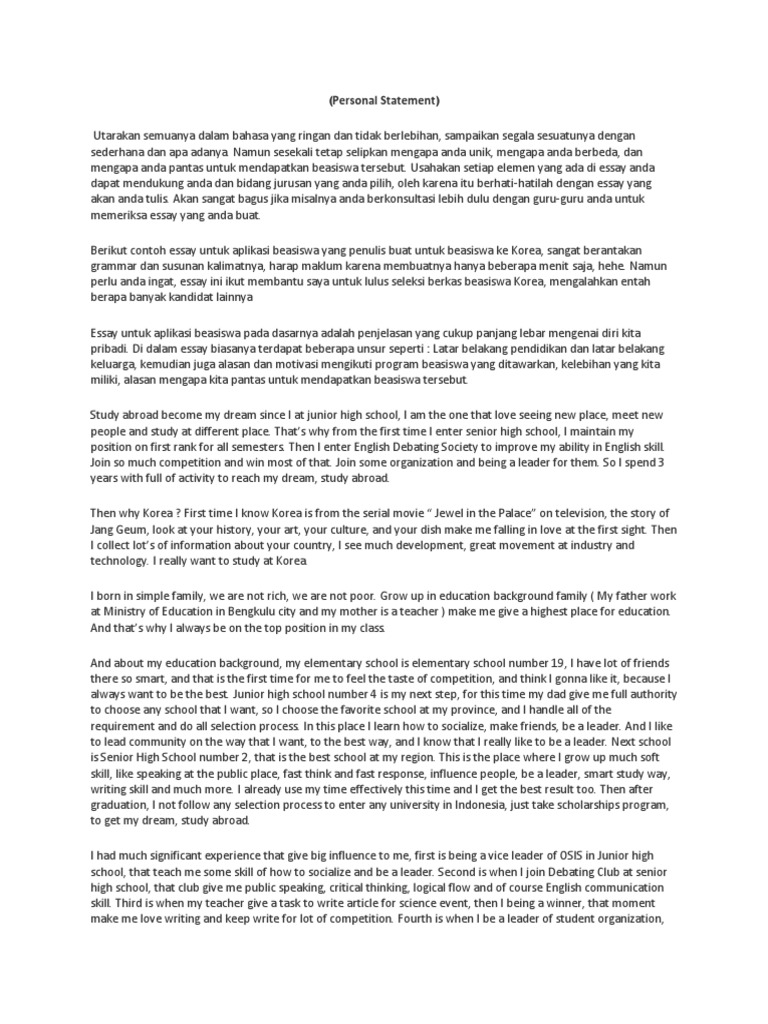 Pulau Raya 1 Sumedang November 8 2014. Download contoh personal statement atau statement of purpose untuk kuliah di luar negeri Bahasa Inggris Personal statement tau statement of purpose SoP adalah salah satu dokumen yang diminta ketika kita mendaftar untuk sekolah atau kuliah di luar negeri. Berikut saya berikan contoh essay saya ketika mengikuti proses seleksi Global Ugrad.