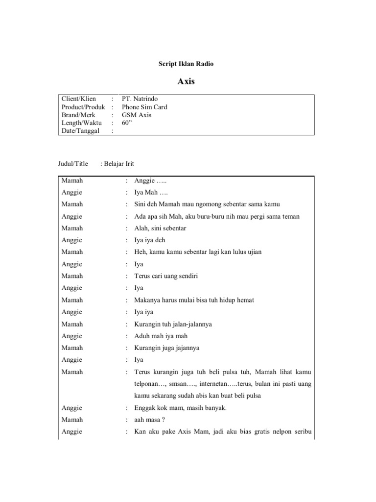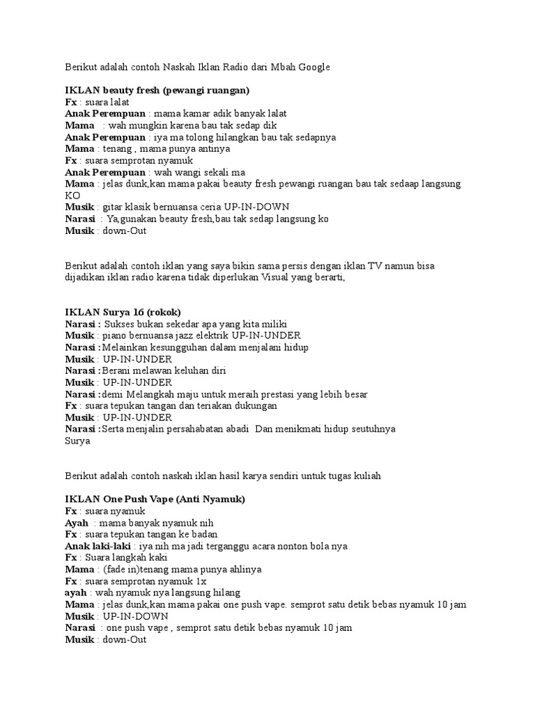 Contoh script iklan di radio. Iklan Radio Iklan radio merupakan salah satu media beriklan yang sangat efektif karena menjangkau langsung audiens sesuai dengan target yang disasar. CONTOH IKLAN TOKO ELEKTRONIK DI RADIO EMA DIARY PRODUKSI SPOT Selain siaran kali ini saya share juga contoh iklan toko elektronik di radio. 2 jam Jam.