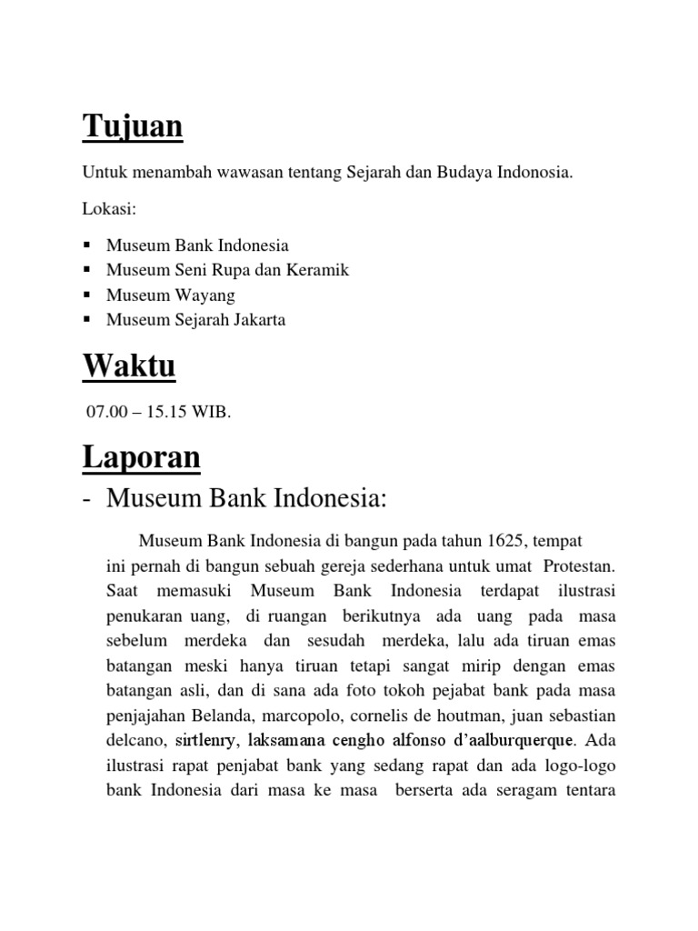 Wali Kelas X MIA 4 Pembimbing II Dra. Kunjungan museum merupakan bentuk pencarian informasi dari luar lingkungan Universitas Gunadarma. Bagi kamu yang hendak membuat laporan perjalanan wisata inilah hal-hal yang harus disertakan dalam pembuatan laporan.