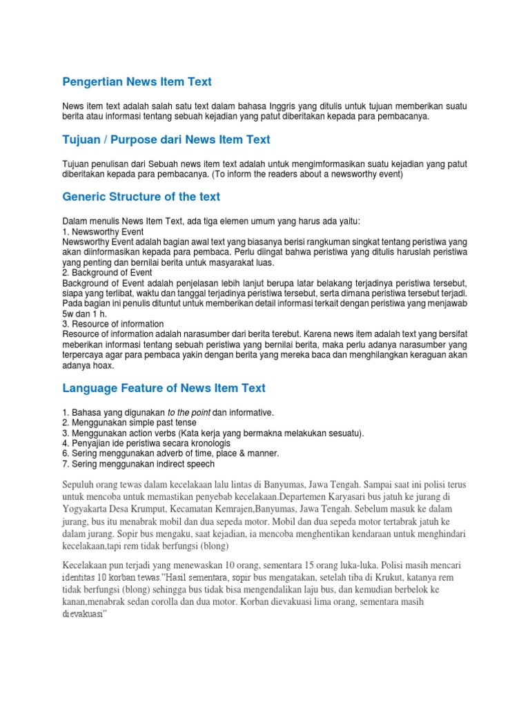Tentunya hal ini tidak asing bagi kita. Oxford English Dictionary News Item Text is a text which inform readers about events of the day Jadi pengertian News Item Text adalah jenis teks yang memberikan informasi mengenai kejadian atau peristiwa harian. Pengertian Fungsi Sosial Ciri Struktur Dan Contohnya - Ada banyak jenis text dalam bahasa Inggris.