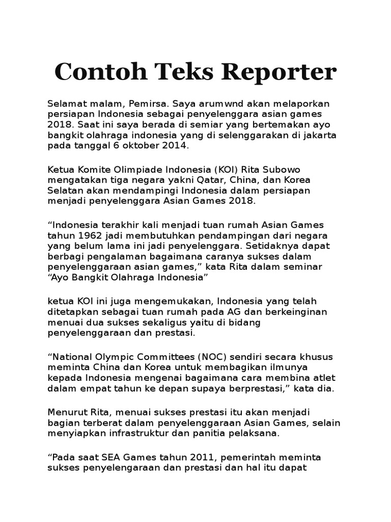 Pengertian dan Contoh Reportase Mendengar kata reportase seperti acara berita di televise Reportase pagi siang malam. Menjadi seorang wartawan bukanlah hal yang mudah. Contoh Pembacaan Berita Oleh Reporter Televisi Dan Pembaca Radio - Oke saya kembali posting dengan beberapa tugas untuk sekolah kali iniKarena saya mendapatkan tugas juga sekedar berbagi pengalaman dan juga sharing kali ini saya akan membuat posting tentang contoh pembacaan berita oleh reporter berita atau reporter yang sedang melaksanakan tugasnya dengan wawancara melaporkan suatu kejadian.